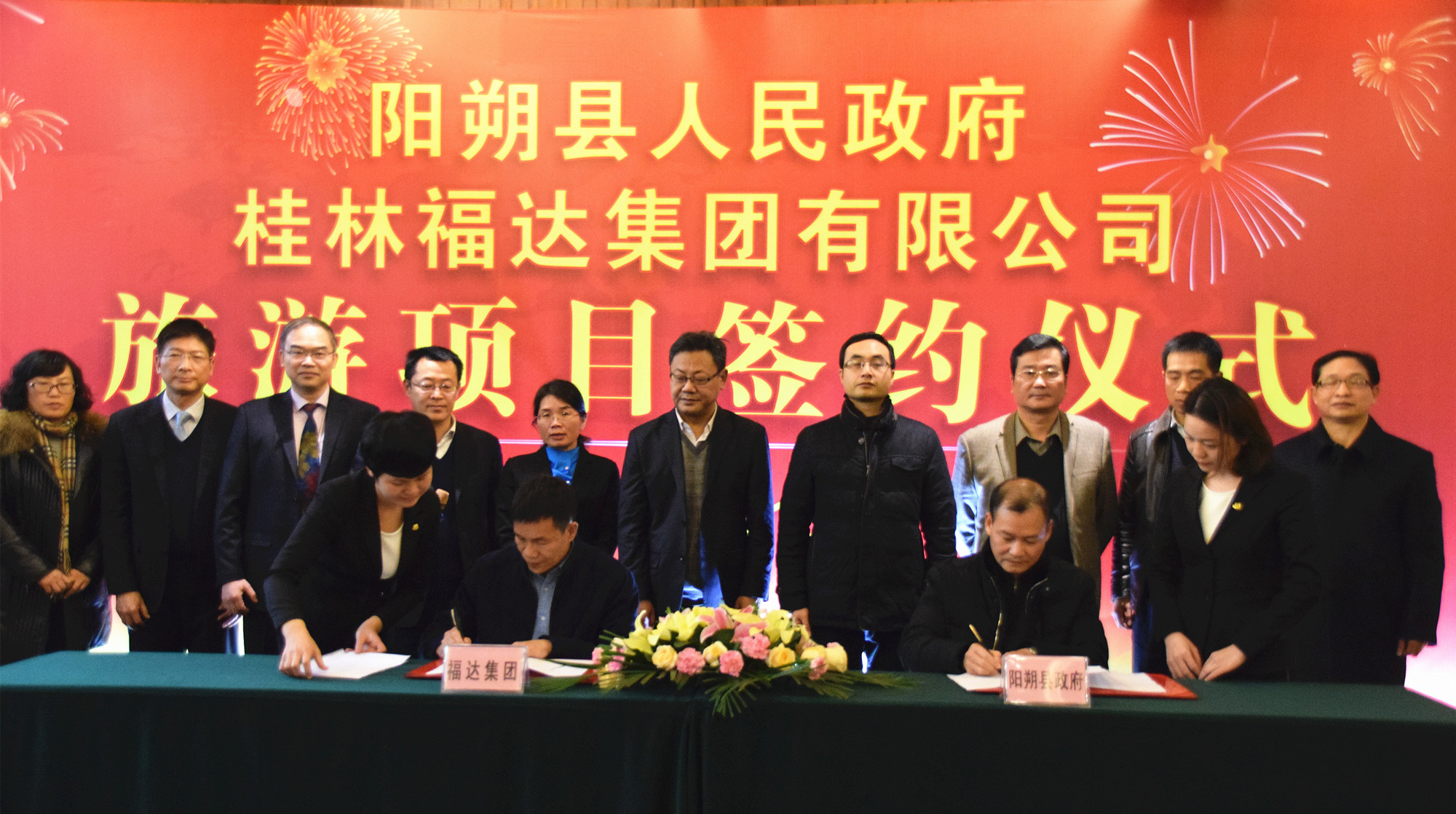 2月10号,福达集团与阳朔县人民政府举行旅游项目签约仪式,福达集团董事长黎福超与阳朔县县长蒋春华签订合作协议。