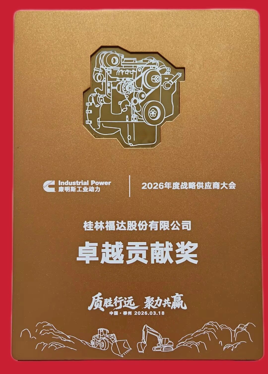 近日,广西康明斯工业动力2026年度战略供应商大会在柳州隆重举行,桂林福达股份有限公司凭借全年综合实力突出、协同成效显著,成功斩获“卓越贡献奖”荣誉称号,这是客户对福达股份深耕配套领域、践行品质承诺的高度认可。